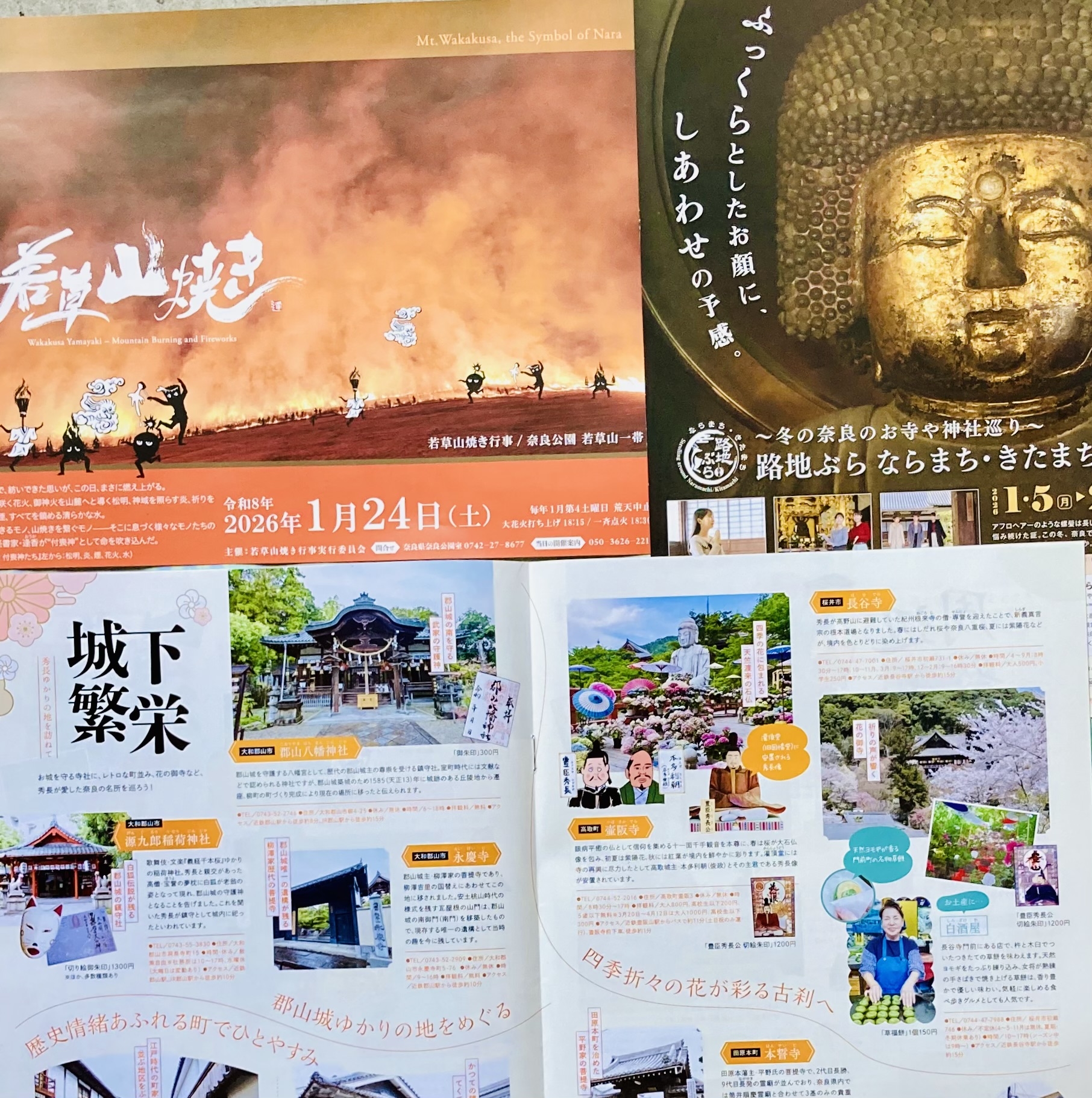 「新しき 年の始の 初春の 今日降る雪の いや重け吉事」新年をいかがお過ごしでしょうか。慶びを祝う新春行事が1つ1つ過ぎ2026年も動き始めました。暦は寒の入りを迎え厳しい冬の寒さが続く季節です。奈良では1月5日~2月28日まで「路地ぶらならまちきたまち」として冬の寺社巡りが開催されています。界隈には藤原・奈良時代から歴史を紡ぐ寺社や仏像、元興寺の一部、草庵など古い町と共に歴史を紡ぐ数多くの寺社が点在しもっと深く奈良を知って頂けます。限定の御朱印巡りもでき新年から特別な御朱印集めを楽しめます。同期間は奈良のいちごを使用したメニューを提供する「奈良いちごまみれ」や土日祝の朝に(24日25日除く)ホルンの音で集まる「冬の鹿寄せ」も行われます。1月24日は恒例行事「若草山焼き」です。澄んだ夜空に冬花火の打ち上げと共に赤く染まる山焼きは奈良の冬風物詩です。また今年の大河ドラマの主人公「豊臣秀長」が城主であった郡山城跡やゆかりの寺社などを巡る大和郡山や宇陀、高取エリアも注目です。今年もぜひ歴史ロマンが詰まった奈良行楽にお出かけください。