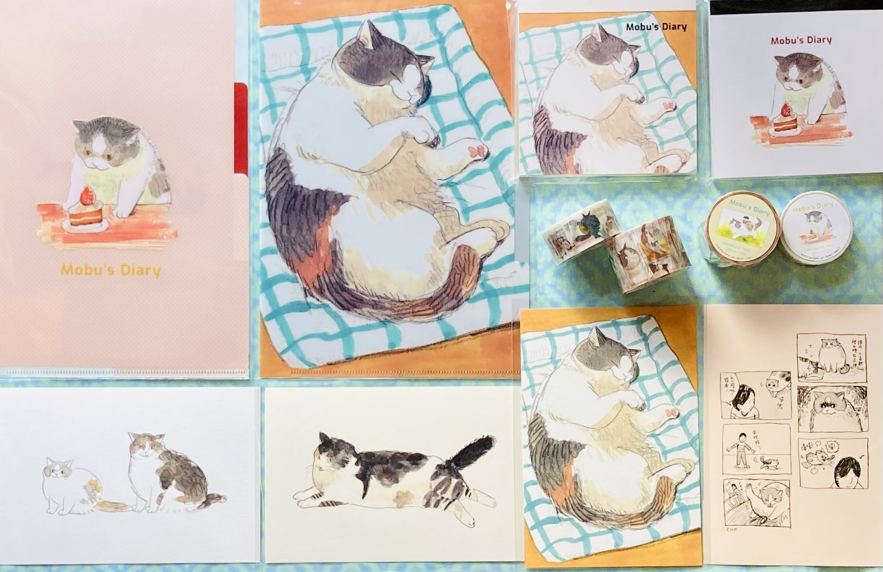 台湾で人気のコミック作品「三毛猫モブは猫缶を稼ぎたい」のデザインMobu's Diary シリーズ。25枚×4柄100枚メモパッドとスティッキーメモが2種、マスキングテープが3種、A5ポケットファイルが2種、ポストカードが4種揃い何れも日本製です。