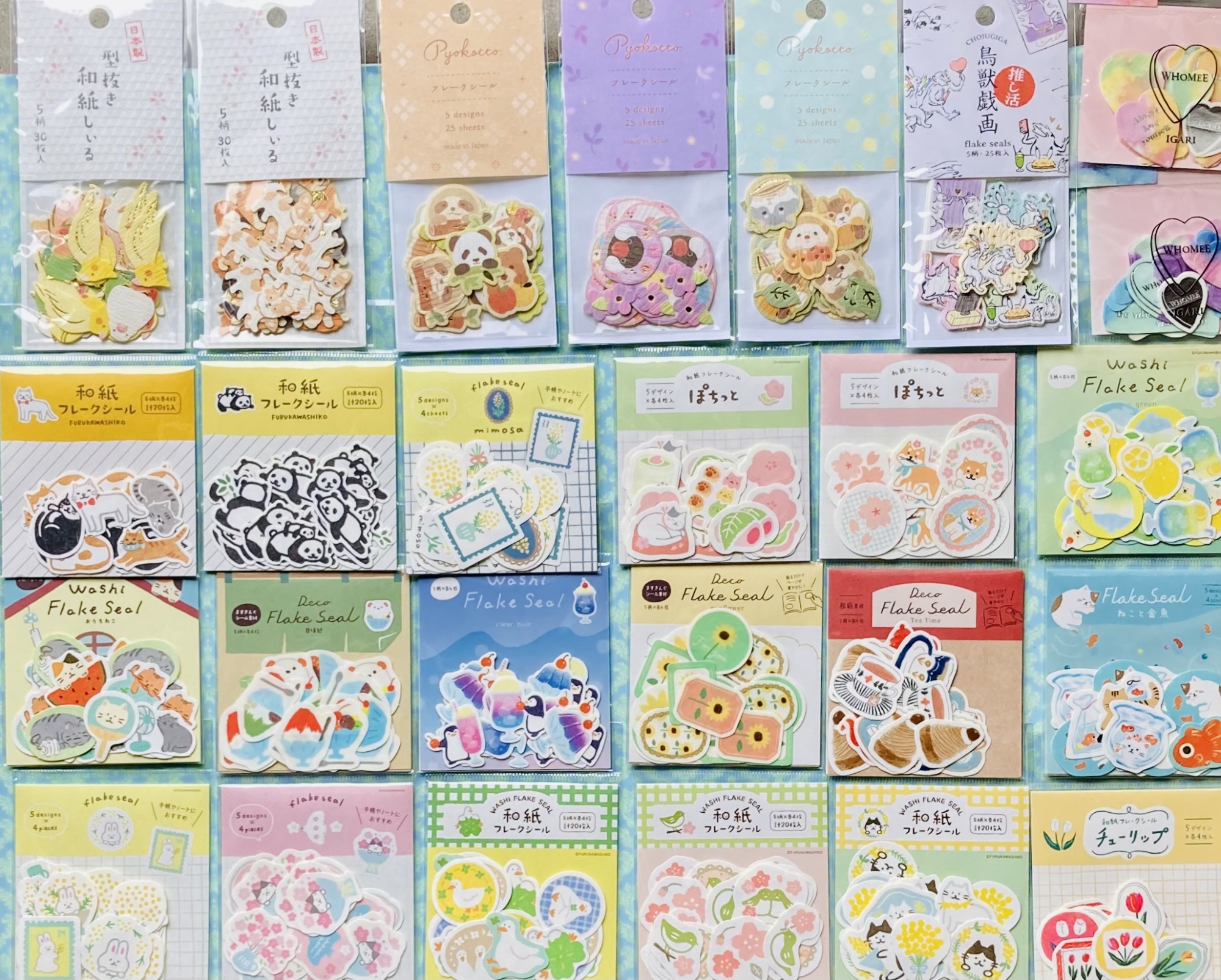 動物や花果実、レトロモチーフなどのほっこり可愛い和紙フレークシール、仕上げ加工により様々な質感が揃うシール、日本画家の絵をモチーフにした渋い大人シール、ちょこっと貼るだけで可愛くなったりかっこよく出来たり楽しいシール。マスキングテープ素材のデコシールもあります。スケジュールや私物管理、手紙の封や雑貨デコレーションなど使い方も様々。自分好みに簡単にアレンジ出来るシールは大人も子供もワクワクな魅力が詰まっています。