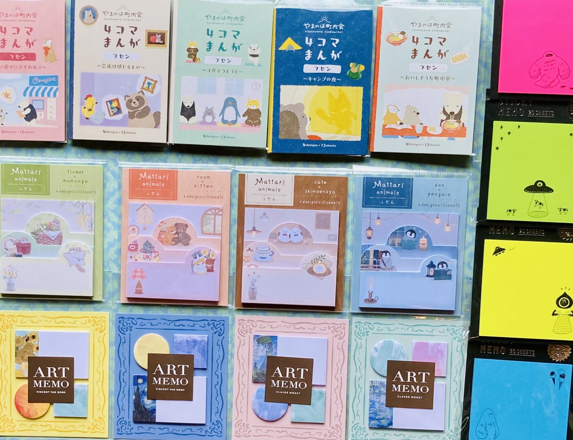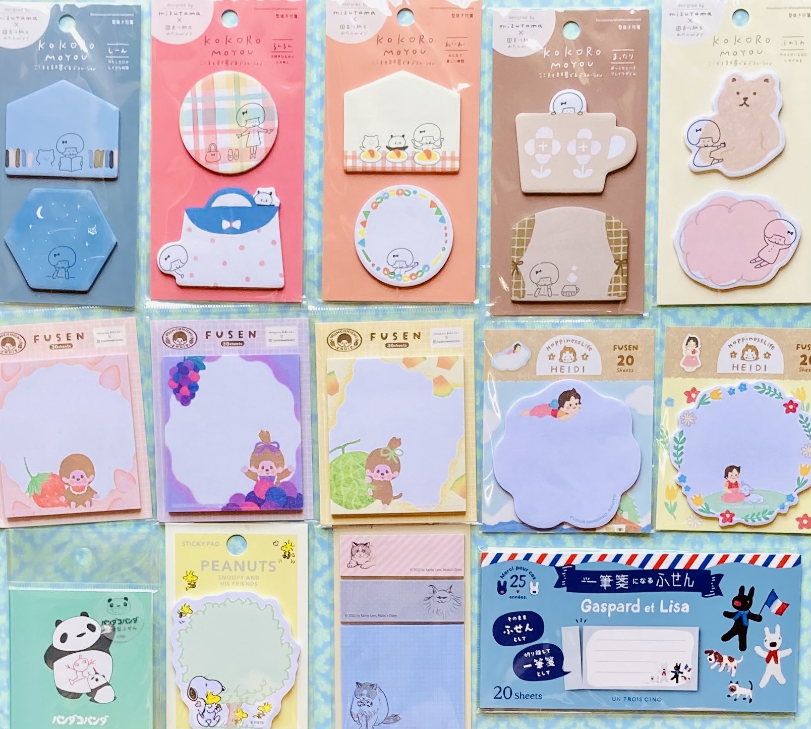 古川紙工の付箋が様々入荷しました。新登場の2柄型抜き「きままふせん」ネコ、イヌ、トリ、クマ、オバケなどのポージングやシーンをデザインしています。小さなブロック型「伝言ふせん」も新登場好きな柄を選べる3柄セットでほっこりデザインが可愛いシリーズです「マイニチ付箋」は大きめで日々のあれこれを記録できます。人気のおねがいポーズでおちゃめに伝言「おねがいふせん」も新柄が4点加わりました。そのほか既存のわたしびよりの型抜きフセンや正方形で使いやすいひとことふせんも新柄を追加しています。
