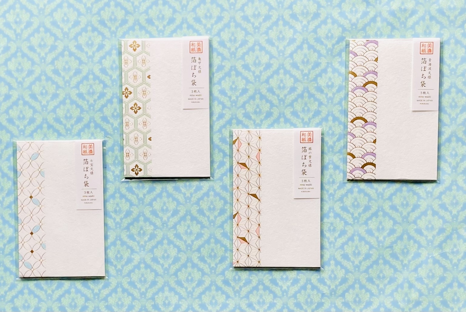 美濃和紙の箔押しぽち袋は七宝、亀甲、麻の葉、青海波の伝統お祝い文様を上品にあしらった特別感のある格調高いデザインです。各3枚入り透け防止の中紙付で440円(税込み)です。お祝いシーズンでもある春~ぜひご活用ください。