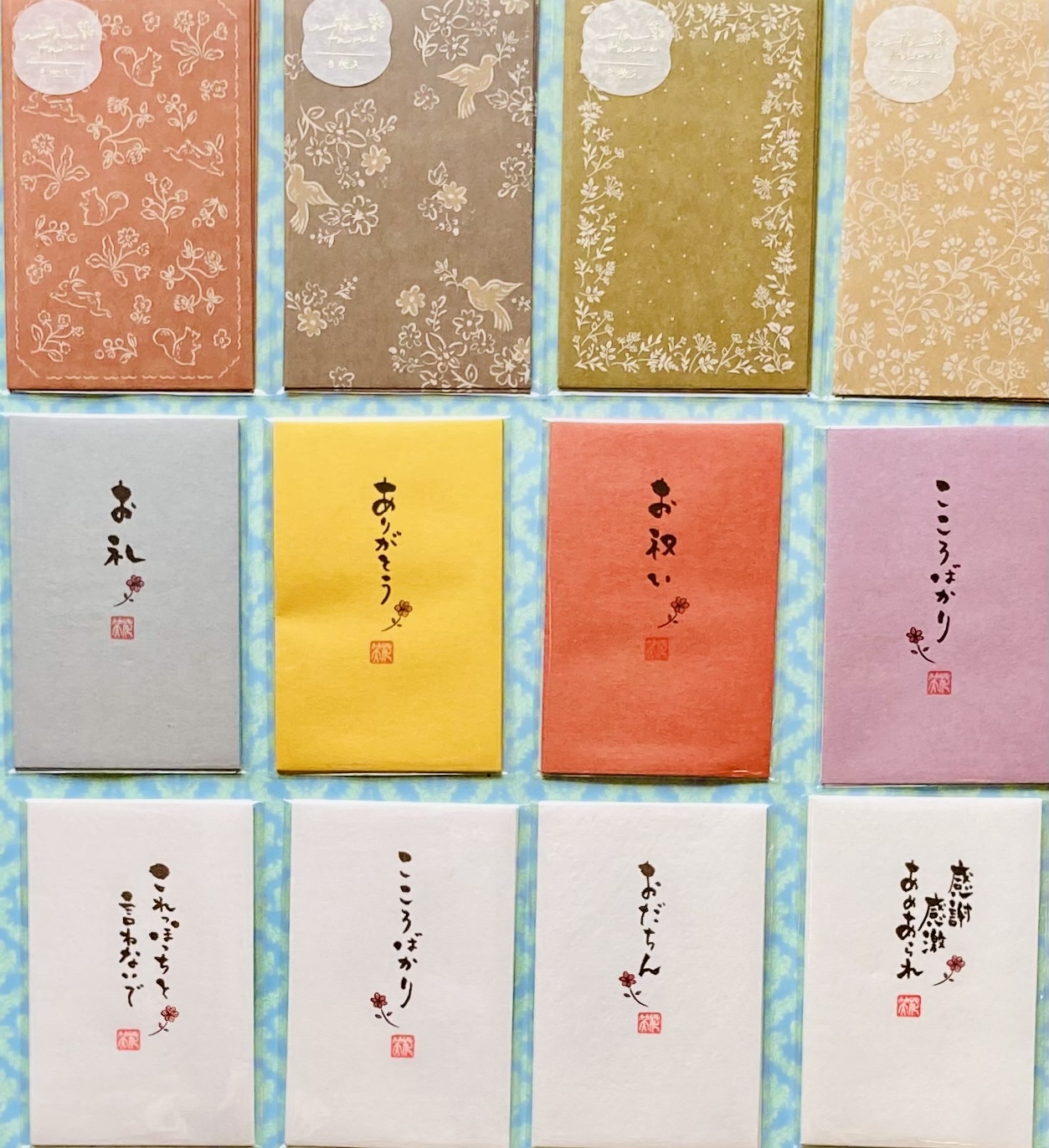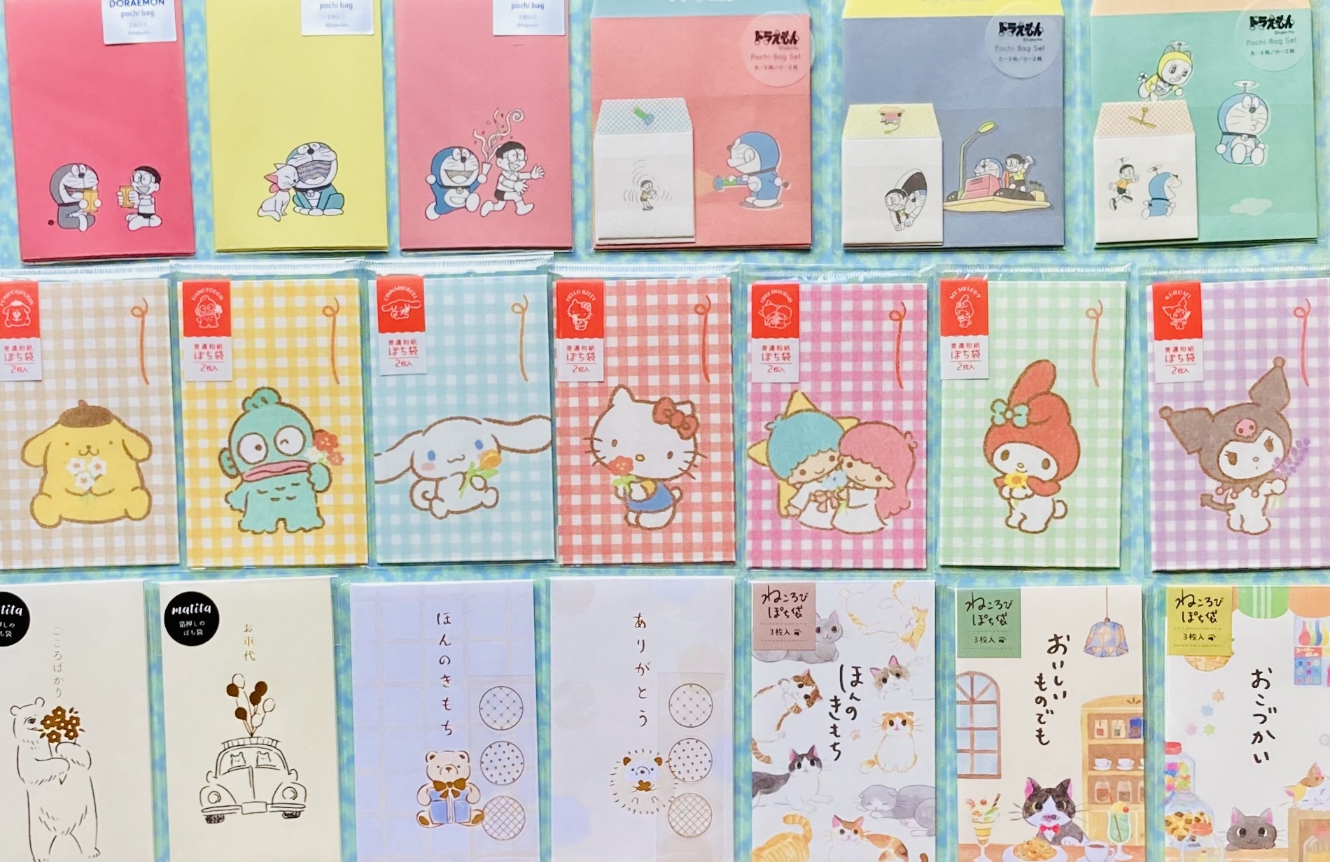 歴史人物などのエピソードをもじったシリーズはハンコ作家の「史緒」さんデザインで白紙と箔入り黒紙タイプがあります。歴史人物の名前をアレンジしくすっと笑えたりダジャレが効いたシリーズは両面に柄が入って和紙5枚入と可愛くてお得なシリーズです。お子様の仕送りやお小遣いにピッタリの一言が入っているデザインやサンリオ・ドラえもんキャラクターモチーフなど個性豊か。お札2つ折りの正方形型や500円玉に合わせたコインサイズもあります。