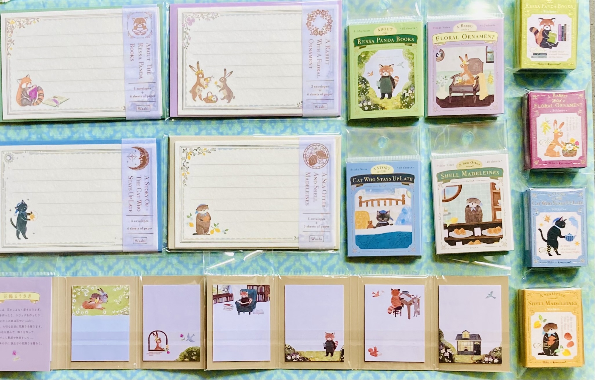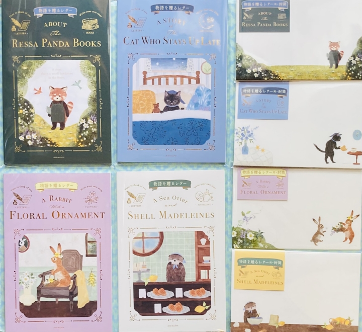 森の小さな書店店主レッサーパンダが物語をテーマにした品々をおすすめするシリーズです。物語は4種~レッサーパンダが書店を開く「レッサーパンダ書店」花好きのうさぎが友達に花飾りをプレゼントする「花飾るうさぎ」夜更かししてしまう猫が長い夜を楽しむ「夜更かし猫」海辺でマドレーヌ屋を営むラッコのお話「ラッコとマドレーヌと」です。便箋はB6サイズで4柄アソート24枚入りで書籍をイメージした横開きです。封筒は2柄アソート4枚入り便箋と合わせて使えます。ミニレターセットは枠飾りとワンポイント入りでプレゼントなどのメッセージとしてもちょうど良いサイズです。フセンは物語の4つのシーンが楽しめる書籍型4柄アソート40枚、レトロ風に描いたフレークシールは7柄21枚で本の装丁をイメージしたボックス入り並べて飾っても可愛いデザインです。各種和紙を使用しイラストレーターawairoさんが淡いタッチで描いたシリーズです。
