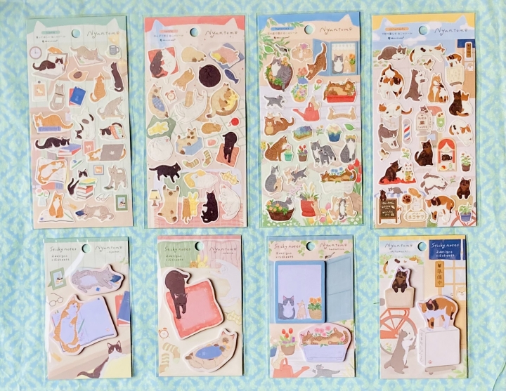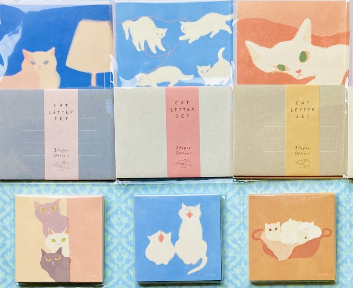猫カフェですごす猫たち&古民家でくつろぐ猫たちをモチーフにした「ねころびシリーズ」は便箋&封筒、一筆箋、付箋、ミニレター、シール、葉書とアイテム豊富で同柄揃える事も出来ます。また便箋&封筒は季節に合わせた限定柄も登場しお便りがより一層楽しくなります。「VILLE et Minou」 パリの猫たちシリーズはシンプルに仕上げたレターセット、ダイカットが可愛いミニレターセット、猫が立ち上がるデザインのフセン、お札が2つ折りの正方形型ぽち袋があり、それぞれ6種のお洒落猫がモチーフです。可愛い子猫の「キトゥンズ」シリーズや和風素材で描いた「ゆるらか」シリーズなども各商品が同柄で揃います。ぽち袋には定番人気の「いやしねこ」「ゆるねこ」「にゃん吉」シリーズがあります。