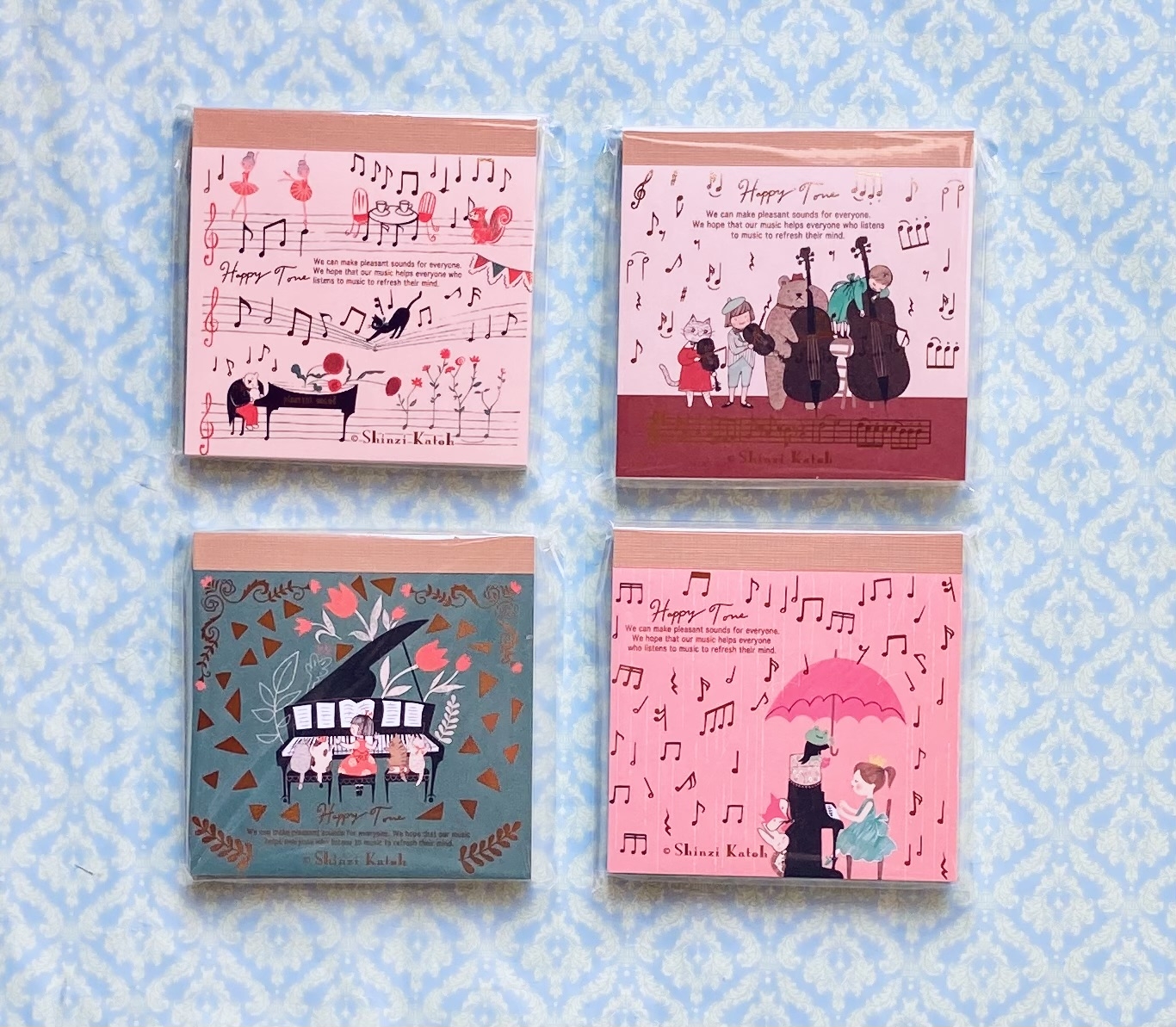 楽器モチーフの25枚×4柄の100枚メモはピアノ2種、トランペット、バイオリンがあります。シンジカトウデザインの可愛い音楽シリーズはカノン、ピアノソナタ、セレナーデ。アイネクライネに分かれて各種25枚×4柄の100枚です。他にも作曲家モチーフのメモやフセン、ノートなどシリーズで揃います。他にも音符柄のレターやミニカードも取り揃えています。ヨーロッパ輸入のグリーンティングやポストカードには本格的な楽譜や楽器モチーフが描かれているクラシックファンにピッタリのデザインがあります。