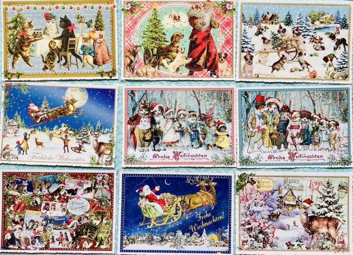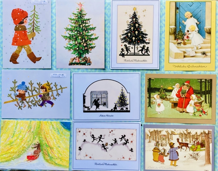 影絵のようなモノクロに差し色をしたシンプルなデザインや「クララ・ソティ」の可愛いレトロ感あるデザインのドイツ。オーストリア「スカイ社」の丁寧に書き込んだ本の挿絵のようなデザインにはドイツ語でメリークリスマスと書かれています。ラメ加工されキラキラしたドイツ「タウゼンドショーン社」はビンテージ風の魅力を生かし最先端技術で仕上げたノスタルジックデザインで昭和感も漂う雰囲気です。それぞれ個性あるラインナップで揃えています。