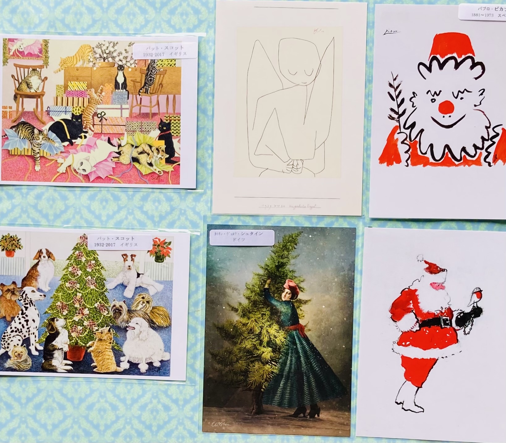 スイス「ポントベル社」から「ミリ・ウェーバー」「エリカ・フォン・ケーガー」が描くクリスマス&ウインターシリーズは何れも柔らかな水彩タッチで描かれています。天使や森の動物、子供たちなどを基調に聖なる夜を感じる落ち着いた色調で仕上げています。その他、影絵のようなモノクロに差し色をしたシンプルなデザインや「クララ・ソティ」の可愛いレトロ感あるデザインもあります。その他ピカソ、スコット、シュタイン、アダムソンなど画家の作品にもクリスマスモチーフがあります。