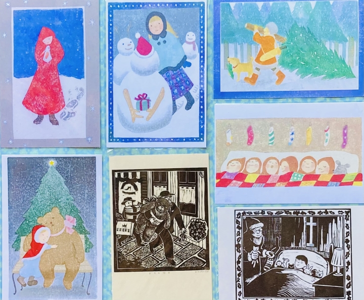 絵本、書籍、全国での個展などガナッシュや水彩絵の具で描く「山田和明」デザイン力と味わいあるアート世界が特徴です。透明水彩絵の具でふんわり優しい手書き作品が特徴の「marron125」それぞれクリスマスモチーフを入荷しました。当店常時販売している木版作家の「古知屋恵子」クリスマスも可愛いデザインが揃っています。その他メーカー商品も揃います。