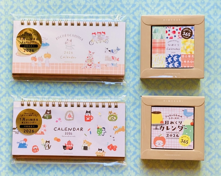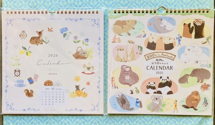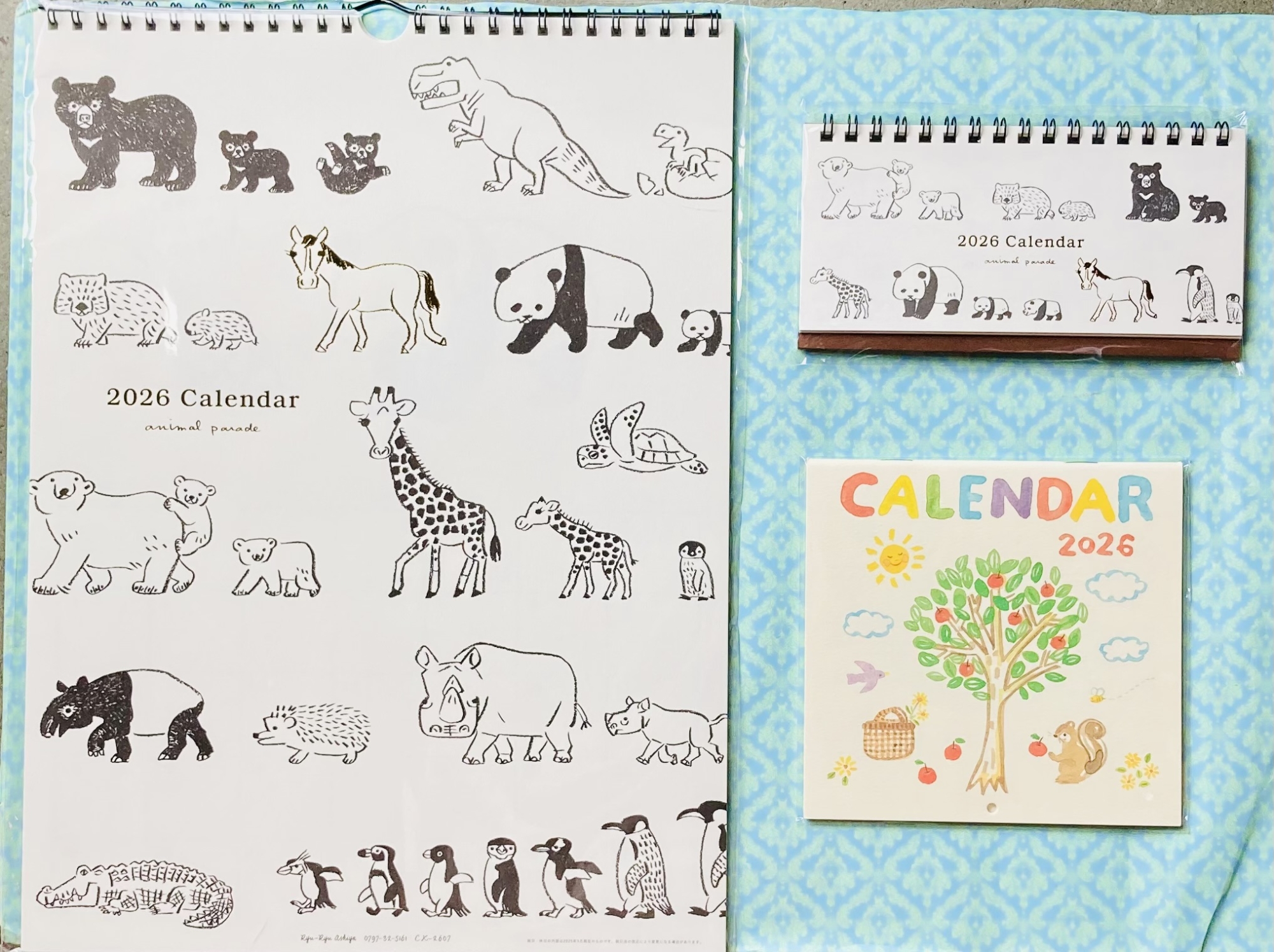 人気メーカーが手掛けるデザイン、イラストレーターコラボなどそれぞれ工夫をこらしたカレンダーが今年も揃います。新登場の「古川紙工」が手掛けるデザインからはフレークシールのワンポイント柄を取り入れた可愛いデザインとゆるくてちょっぴり不思議な手書きが人気のイラストレーター「トコロコムギ」さんデザインコラボの卓上リングカレンダーが2種、レトロモチーフ、シリーズ柄を取り入れたデザインと折紙やレターなどに使用された総柄の日めくりカレンダー2種です「エヌビー社」のシリーズモチーフもカレンダーになりました。手書きタッチにぬくもりがあるawairoと動物園や水族館で暮らす仲間ZOOm in Animalsをそれぞれ壁掛けカレンダーにしています。何れも可愛いくて部屋を明るく楽しくしてくれるデザインです「リュリュ」からは10年以上のロングセラー「中島良治」さんのアニマルパレードから壁掛け・卓上何れも揃えました。シンプルなモノクロタッチは制別問わず人気です。柱などに飾れるコンパクトな壁掛け水彩カレンダーは六曜表示もあり使いやすい定番商品です。