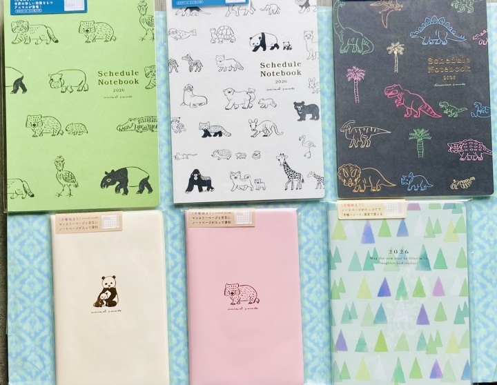 イラストレーター中島良治さんデザインのアニマルパレードシリーズは使いやすさに定評があり10年以上のロングセラーでリピート率も高い商品です。A5タイプは今年9月~2027年の1月まで書き込めるマンスリースケジュール~todo/checkリスト、1日を2つに仕切っての使い分け、六曜表示なども備え管理しやすいデザインです。方眼ノート、ミシン目のついたメモ、アニマルシールも付いています。表紙柄はオールアニマル・珍アニマル・ダイナソーの3種を揃えました。またより一層使いやすくカスタマイズできる同柄デザインのクリアカバー(ジップ付・ジップ無)もあります。持ち運びにぴったりのB6変形スリムは表裏にワンポイントの箔押しデザイン、マンスリースケジュールは今年9月~2026年12月まで縦軸で確認できるカレンダーや前月・翌月のカレンダー、2つの仕切り、月の満ち欠けを入れて月ごとにマンスリースケジュール後にノートページを入れて予定管理できるデザインです。パンダとウォンバットの2種があります。