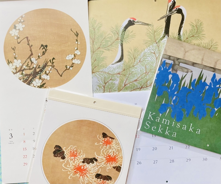 毎年好評の日本画家カレンダーは2種「神坂雪佳」は明治時代に刊行された木版画集百々世草より月ごと12図を配した使用時縦420㎜×横297㎜の壁掛けタイプで日付欄も大きく書き込みも可能なデザインです。「伊藤若冲」は100種以上の花の天井絵を収めた若冲画譜より季節の花を配した縦420㎜×横200㎜の縦長で76回全国カレンダー展銀賞のデザインです。