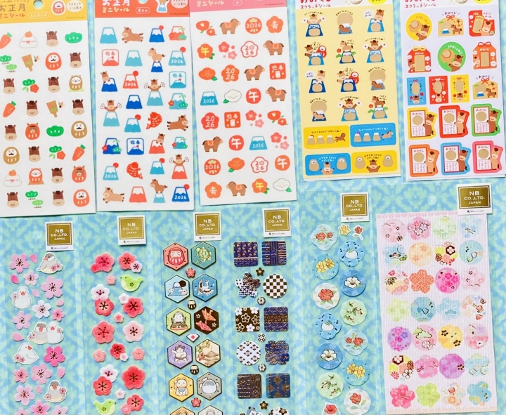 干支午柄のお正月シールは貼ってはがせるマスキング素材です。年賀はがきの余白に貼るだけで簡単オリジナルが完成。他にも手作りぽち袋や年始の飾りつけなどにもポップで可愛いく仕上がります。おみくじスクラッチシールもワクワク感のある年賀が作れて