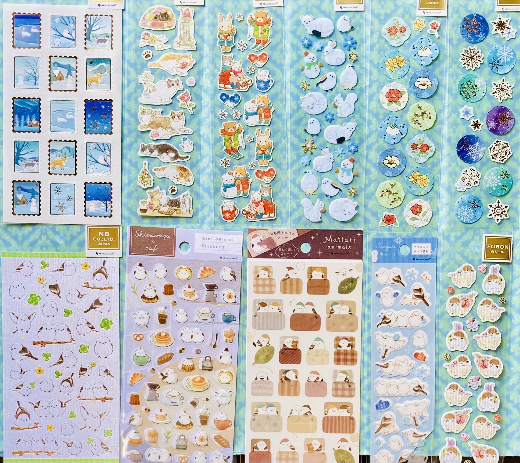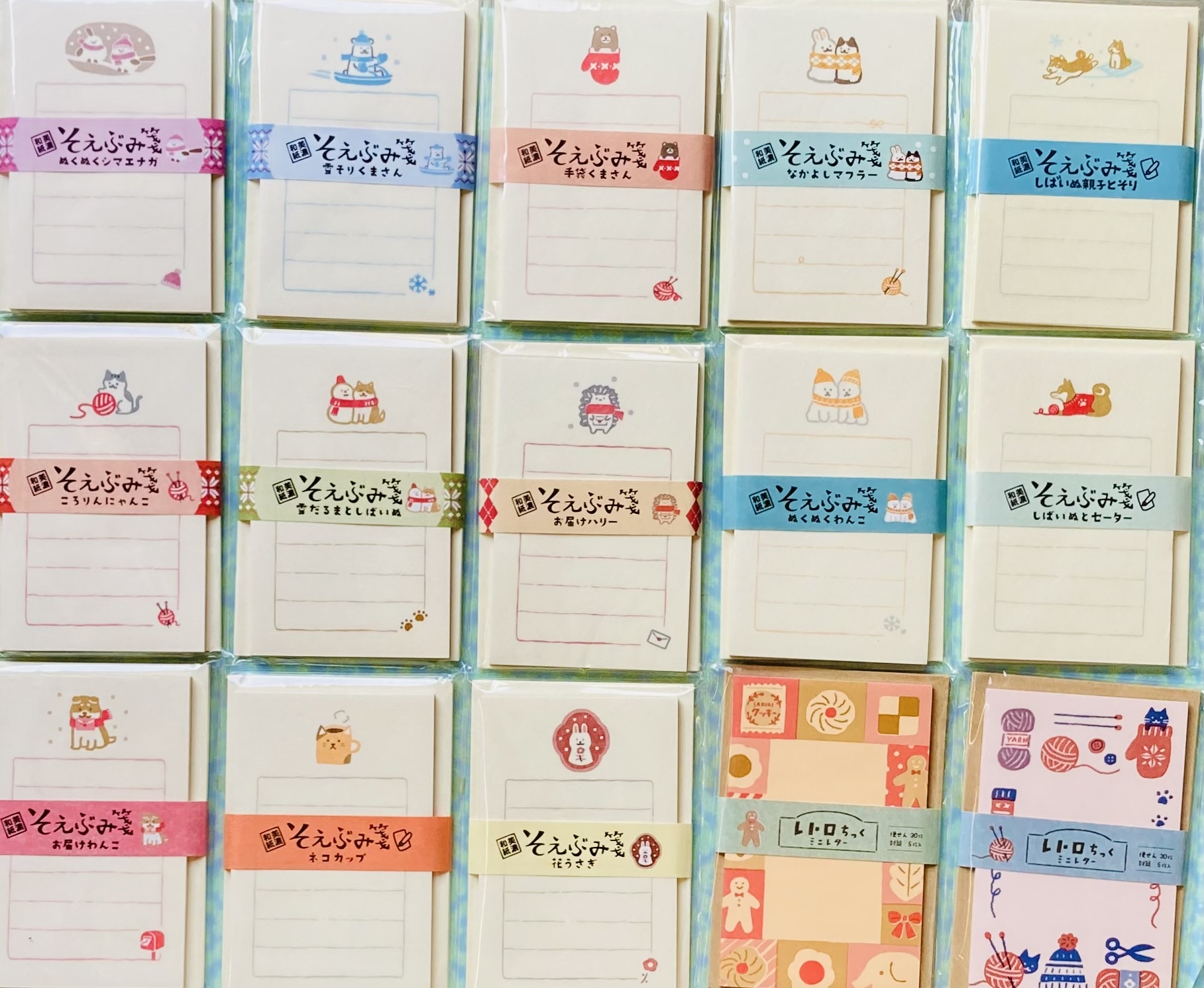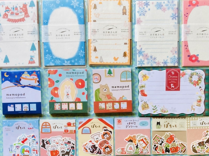 お手紙さんぽの冬柄、4柄×25枚の100枚綴りメモパッド、あったかモチーフと犬猫などが可愛いフレークシール、シマエナガやオコジョ、雪など冬柄の色々なシールなど揃いました。