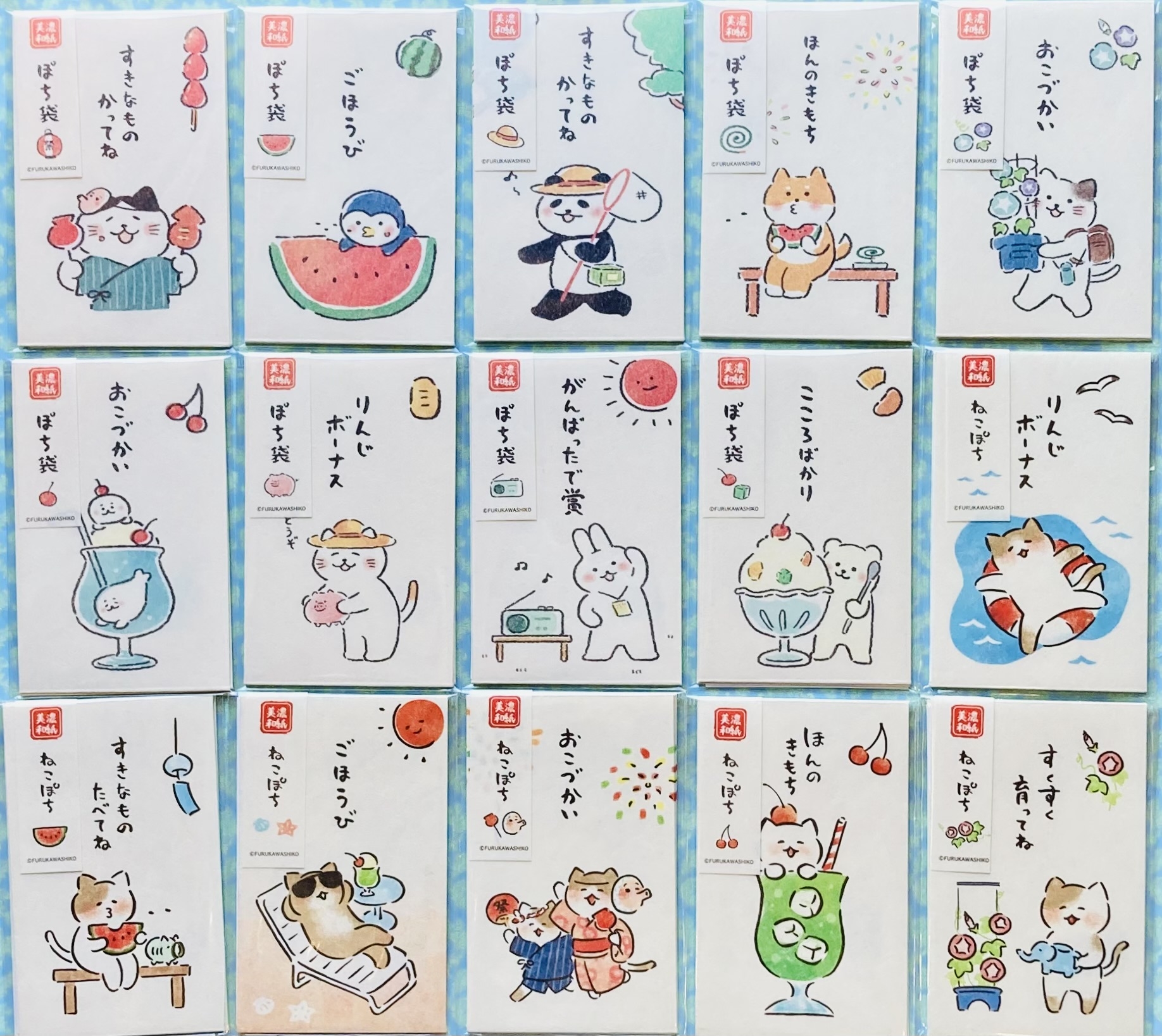 定番人気のそえぶみ箋やお手紙さんぽの夏柄をはじめ金魚と夏祭り柄4柄×25枚の100枚綴りメモパッドやパフェやクリームソーダなどの夏スイーツメモ、お子様へのおこずかいやごほうびに可愛い動物の夏柄ぽち袋、夏花、金魚、夏バカンス、かき氷や夏スイーツのデザインを可愛くデザインしたシールなど限定柄が揃いました。ぜひ日常に季節感を取り入れてみて下さい。